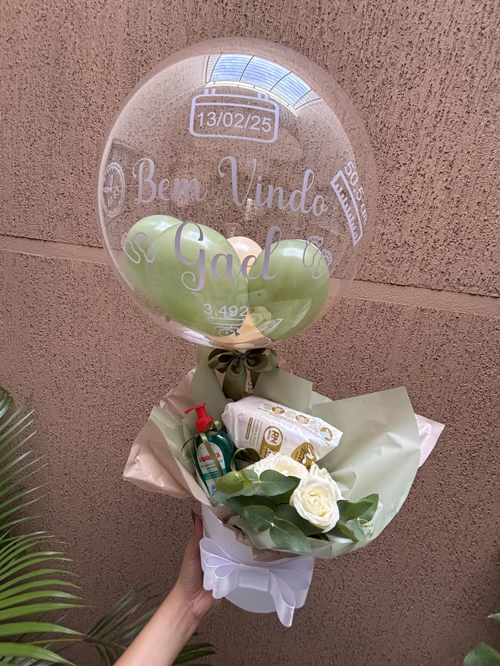 Entrar em contato pelo WhatsApp para personalizar Balão. Box cartonada com uma fralda, um shampoo, um mini arranjo de rosas e um balão personalizado.